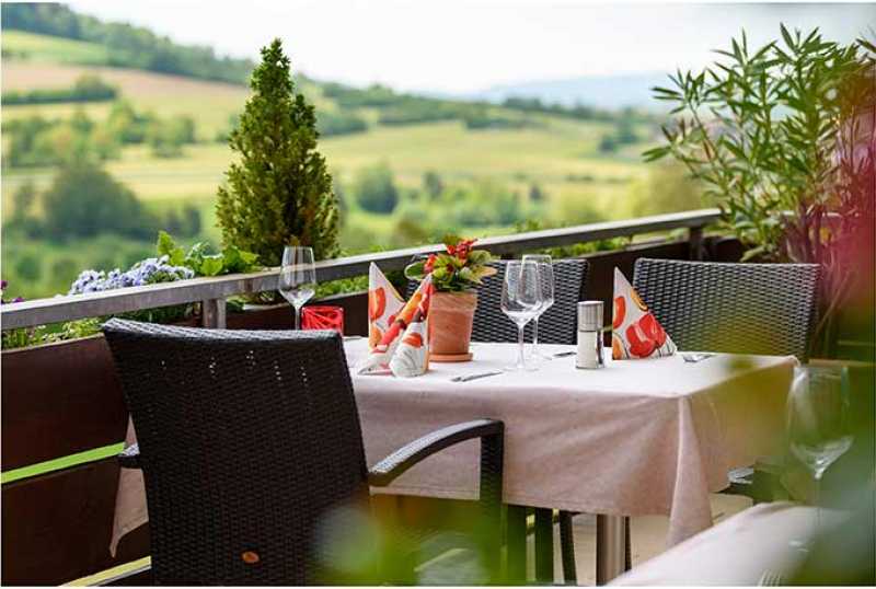 Restaurant und sonnige Terrasse mit Panoramaweitblick über die Lamer Bergwelt, gutbürgerliche Küche mit saisonalen Höhepunkten, vegetarische Küche, glutenfreie und laktosefreie Gerichte