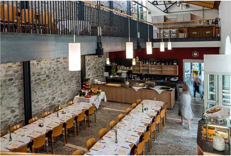 Wir bieten unseren Gästen geschmackvolle Speisen: nach Möglichkeit regional und saisonal. Bis zu 120 Personen finden im Restaurant Platz, das in den ehemaligen Stallungen untergebracht ist.
