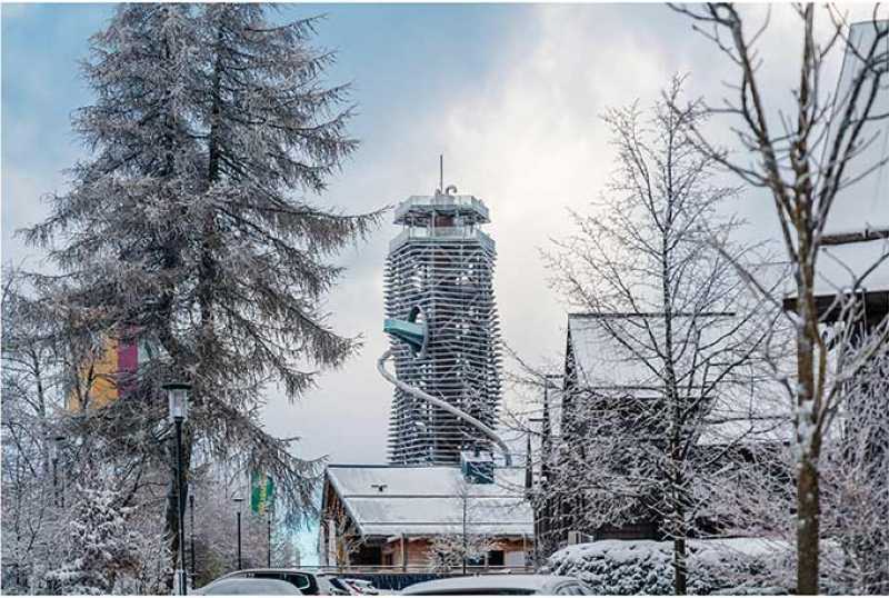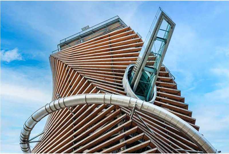 Die 65 Meter hohe Turmschraube imitiert einen hohlen, drehwüchsigen Baumstamm. Dafür wurde das intelligente Naturdesign des aufgehenden Fichtenzapfens zum Vorbild genommen.