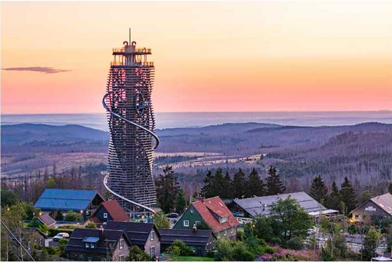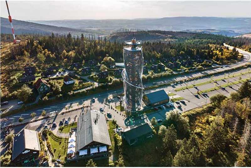 Die hölzerne, sich in Richtung Panoramaaussicht hochschraubende Turmskulptur stellt einen magischen Anziehungspunkt und Begegnungsort inmitten der unverwechselbaren Natur- und Kulturlandschaft des Oberharzes dar.